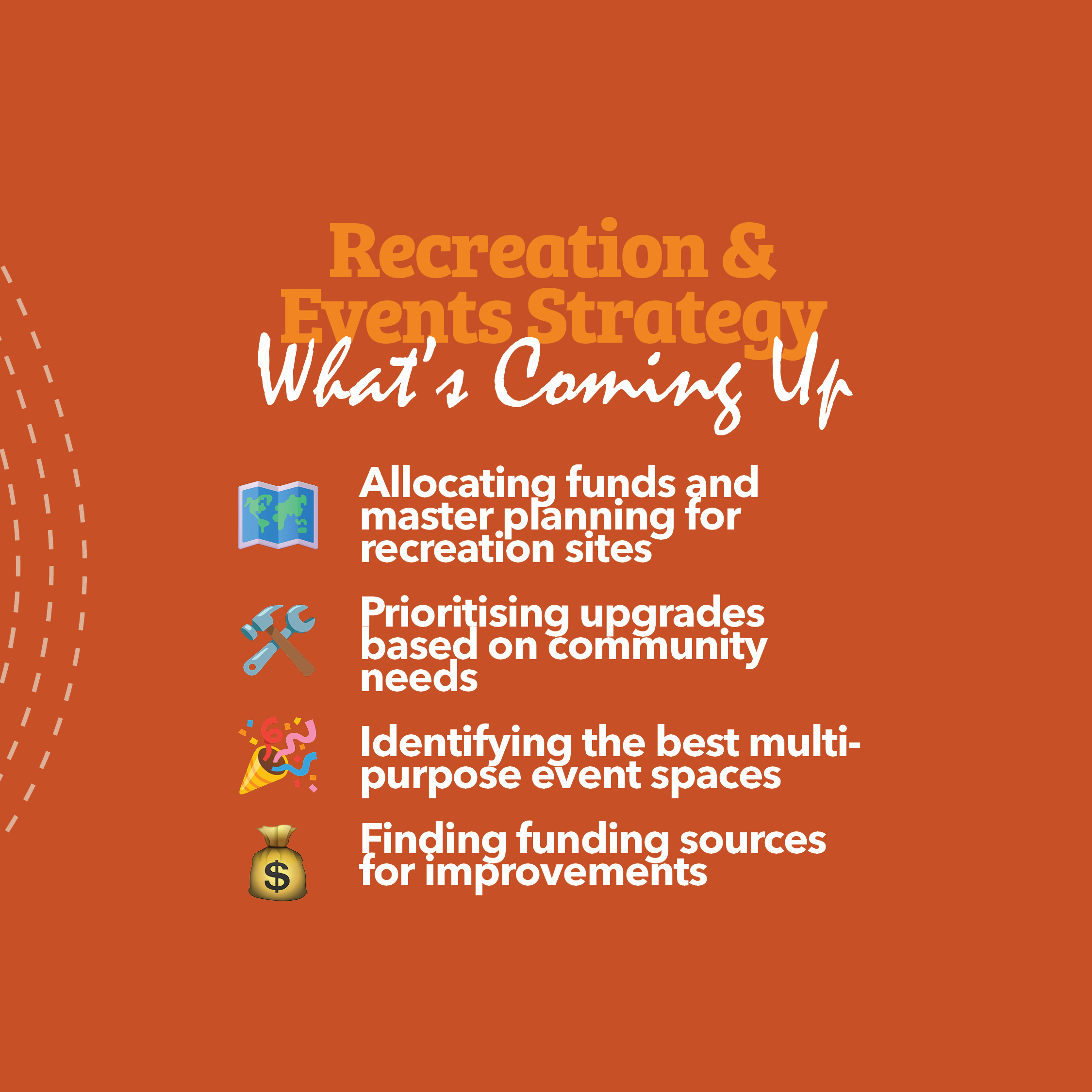 This strategy will determine facility improvements and priorities related to sport, recreation and events. This project will: